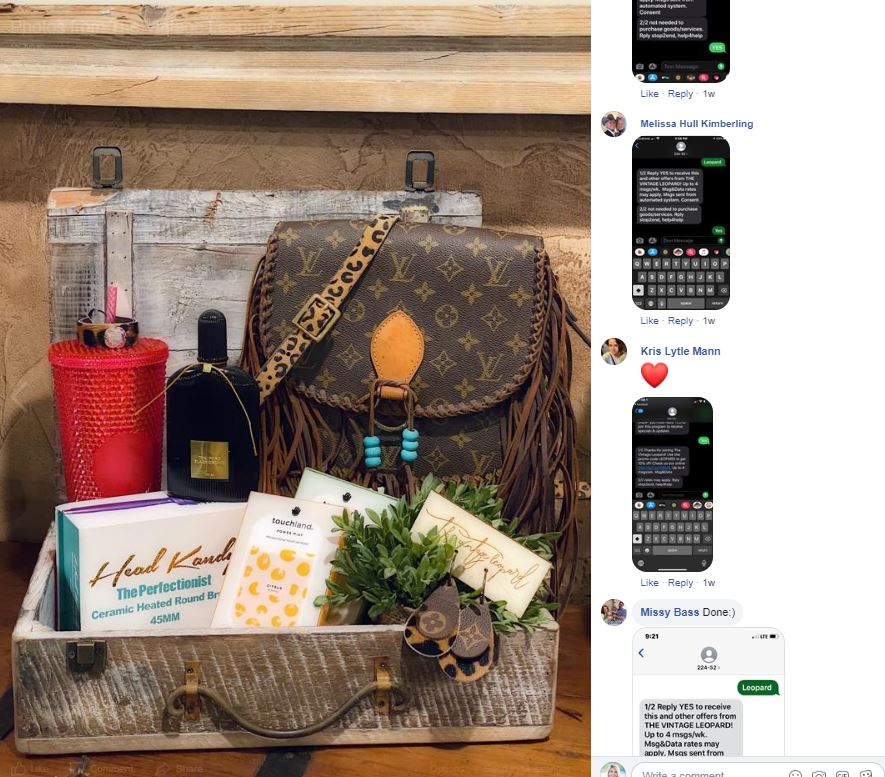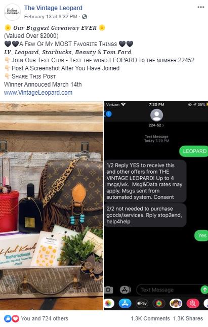 Here are a few examples of how you can first gather subscribers using your social media audience. Recently, Vintage Leopard, a SenText Marketing Partner, created this contest with ideal success. They distinctly executed an exciting call to action and asked their audience to engage by texting in, posting a screenshot, and sharing. Fans freely commented and were truly excited.